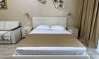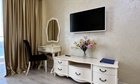 В спальной зоне установлена большая, шикарная двухспальная кровать с мягким подголовников, с прикроватными тумбочками и светильниками «бра»; установлен кондиционер. На против кровати установлен большой плазменный телевизор, туалетный столик с большим зеркалом.