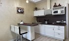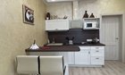 Жилая комната разделена на спальную зону и зону кухни. В кухонной зоне имеется встроенная кухонная мебель и бытовая техника: электрическая плита, вытяжка, посудомойка, фильтр на питьевую воду, чайник, микроволновка. Для удобства приема пищи, сделана барная стойка со встроенными тумбочками и полками для кухонной утвари.